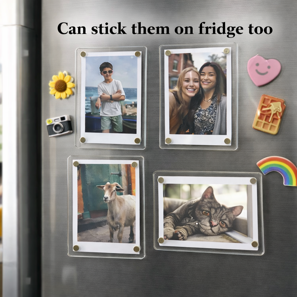 Why keep your memories hidden in your phone when you can display them beautifully? Our premium acrylic polaroid frames are designed with a smart 2-in-1 concept — use them as fridge magnets or as an elegant desktop photo frame.