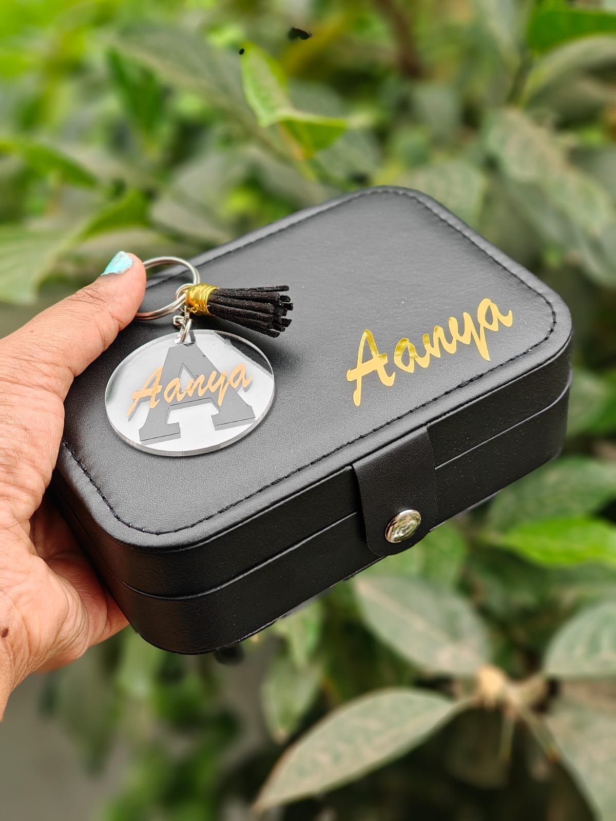 🎁 A premium gift set – Customized Black Jewelry Box with Name + Matching Keychain in black & gold. Perfect for birthdays, anniversaries, bridesmaids, or elegant return gifts.