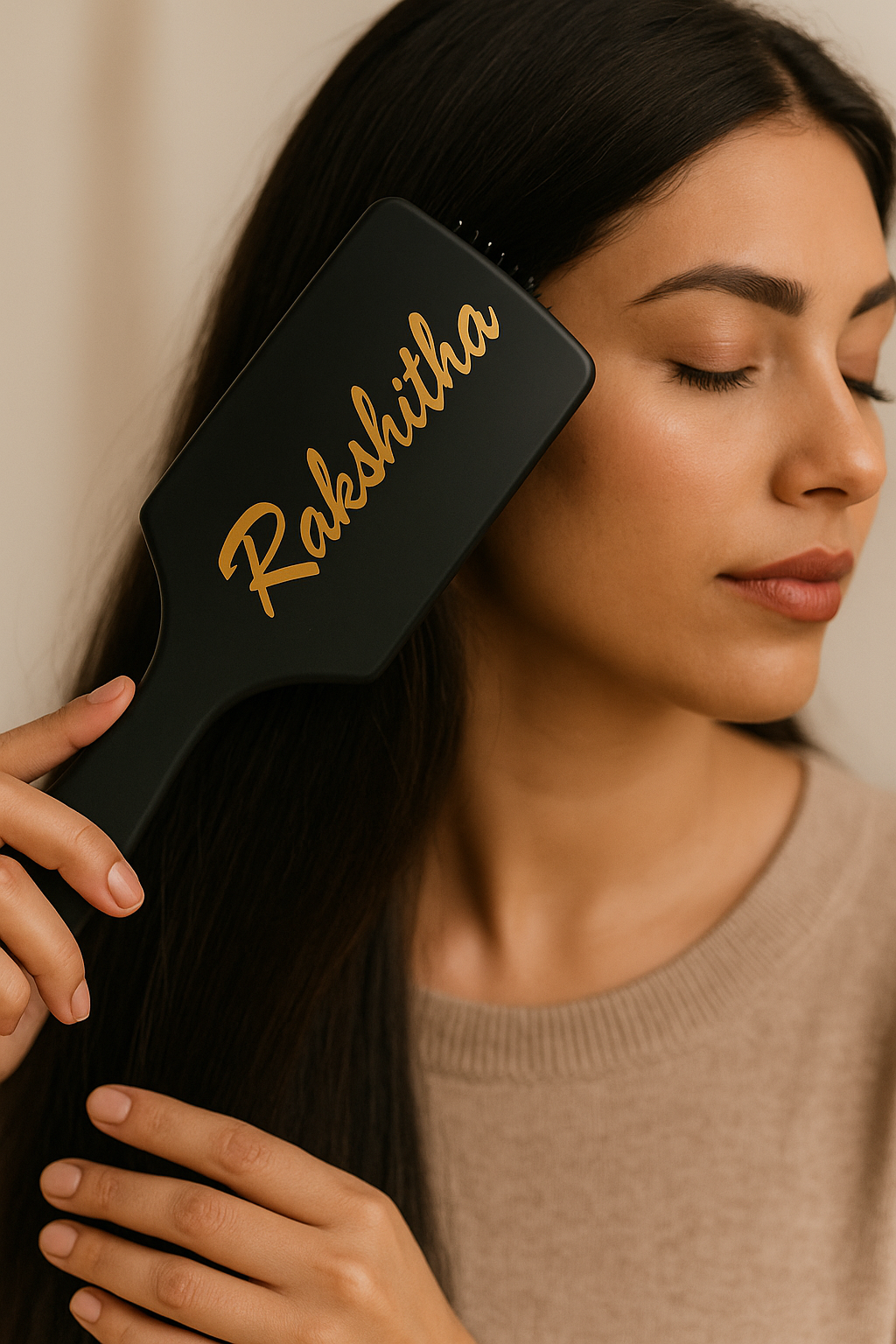 ✨ Style your hair in elegance with this customized hairbrush featuring your name in gold or silver print. Perfect as a personalized gift, daily essential, or return gift idea – practical, stylish, and uniquely yours!