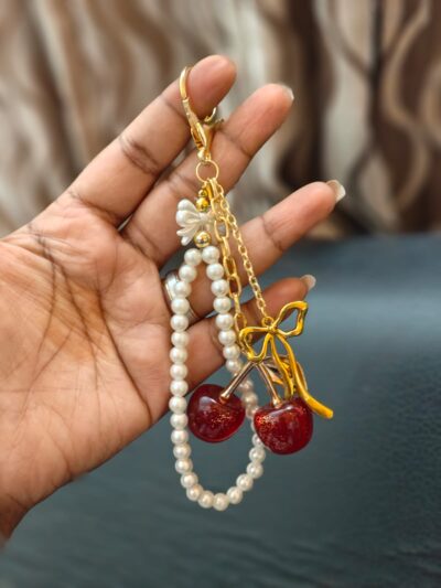 3D Cherry Bag Charm with Anti-Tarnish Gold Chain links | PVD coated | Stainless Steel Gold bow | white Pearls | Keychain ring attached